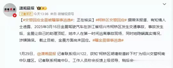 1月29日,女星金晨因涉嫌交通肇事逃逸登上热搜,随着事件的关注度不断攀升,关于金晨的丑闻蜂拥而至,当地警方也回应此事,已成立调查组,正在核实。