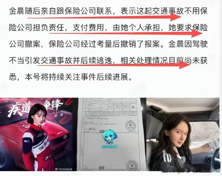 知情人士还透露,得知保险公司报案后,金晨迅速与保险公司取得联系,提出愿意个人承担事故全部赔偿费用,条件是保险公司撤案,保险公司经过考量后撤销了报案。